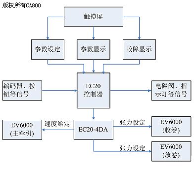 (2)EC20控制器:该控制器是艾默生公司的高性能控制器,它是整个系统的控制中心,协调外围设备的动作,并按用户设定的工艺控制设备的运作。通过EC20-4DA模块对变频器作张力给定和频率设定。