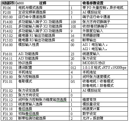 收放卷电机选用的是艾默生高性能张力专用型变频器EV6000-T-4T0370G,以下是该变频的主要功能码设置。