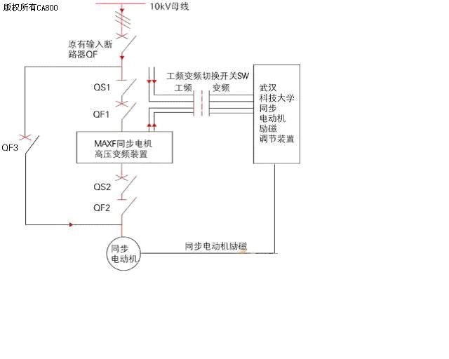 同步电机变频调速系统改造用的变频调速装置应具有工频旁路回路设计。改造后,不能影响原来工频方式的所有操作、保护。设计时采用一个转换开关,具有工频方式和变频方式两个位置。将转换开关转至“变频”位置,则变频装置旁路柜开关qf3分闸,延时2秒qf1、qf2合闸,而且励磁系统的控制线路切至变频方式;将开关转至“工频”位置,则变频装置旁路开关qf1、qf2分闸,延时2秒qf3自动合闸,而且励磁系统控制线路也恢复成工频方式。具体系统原理图请见图1。