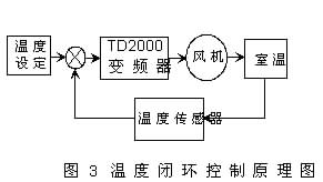 在该系统中,冷冻泵、冷却泵、水塔风扇变频器采用开环控制,由维护人员根据季节不同和负荷的变化进行调节;风机采用温度闭环控制,可根据温度传感器的反馈值,调节风机的转速,从而使被控环境温度基本保持恒定。原理图如下所示: