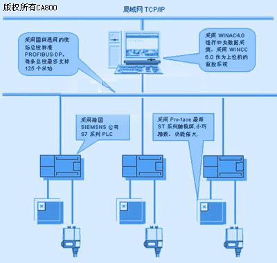 采用德国西门子公司的S7系列PLC作为机电一体化机组的现场控制设备,通过智能通讯模块与中央数据采集的PROFIBUS总线相连,中央数据采集由德国西门子公司最新推出的基于PC的自动化产品WINAC 4.0承担,该产品可以结合PCI插槽的CP5613卡实现4条PROFIBUS总线下最大500个PROFIBUS从站(125×4)的网络连接,上位机的监控软件则采用西门子公司在自动化领域最先进技术与微软公司共同开发的处于世界领先地位的组态软件WINCC 6.0。而在触摸屏部分,选用了在HMI市场处于领先地位的Pro-face公司最新推出的小型触摸屏ST系列。系统结构参见图1: