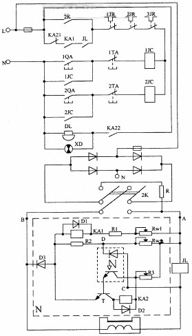 若工作正常,N中的CD两端电压UCD<0.9V,光电耦合器截止,三极管T也截止(由于光耦器输出电流较小,故用三极管T来放大电流作为驱动元件),继电器KA2线圈不通电,其常闭接点KA21闭合,为电机的启动做好准备,其常开接点KA22断开,电铃DL不响,报警指示灯XD不亮;若吸盘线圈断开(或接触不良),N中的CD两端电压UCD>09V,光耦器导通,三极管饱和导通,KA2线圈获电,其常闭接点KA21断开,电机控制支路断电而使电机停机,达到了保护作用;同时常开接点KA22闭合,电铃DL响,信号灯XD亮。起到声光报警的功能。欠流继电器JL的保护作用与原电路一样。