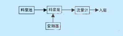 在湿法水泥窑煅烧过程中,窑尾料浆的喂料控制是至关重要的一环,它直接关系到水泥熟料的产量和质量。传统的喂料控制方式有2种:(1)勺式喂料:单位勺的容积一定,通过调节直流电机转速来控制喂料量,这是老湿法窖普遍喂料方式,计量较准,但控制较复杂;(2)采用阀门调节,用电磁流量计进行计量的方式,这是近几年发展起来的喂料方式,控制较简便,但阀门执行器频繁动作,易出故障。以上两种方式料浆泵都是以工频恒速运行的。如图1所示为第2种喂料的框图(第一种把流量计和阀门换为勺式机),对于料浆泵,具有以下特性:其(流量)Q∝N(转速),(扬程)H∝N2,(轴功率)W∝N3。当流量减小时,如果泵的转速也随之下降,则轴功率可以降低很多,如果采用改变料浆泵的转速来调节料浆的流量,就能节约大量能量。而变频器具有良好的驱动性能,包括PID控制等先进控制算法、丰富的控制功能以及节能节电等显著特点,因此可以采用变频器来对原喂料方式进行改造。