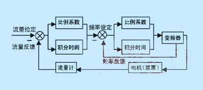 由于我厂使用DCS过程控制系统,这为实现喂料的手、自动控制带来了方便,手、自动切换和控制算法由DCS系统实现,变频器作为执行器,采取双闭环控制方式 如图3所示,外环为流量控制环,内环为变频器频率控制环;DCS系统接受实际流量信号和变频器的频率信号。设定流量与实际流量的偏差经运算后作为变频器的频率设定信号,与变频器的实际频率信号比较,运算结果作为变频器的实际频率信号。由于料浆泵有30m多的扬程,变频器低于31Hz时抽不出浆,而到39Hz时,就达到最大流量60m3,所以我们限定了变频器的运行频率,调节范围为31Hz~39Hz,它和DCS系统送出的0~10V频率信号对应。