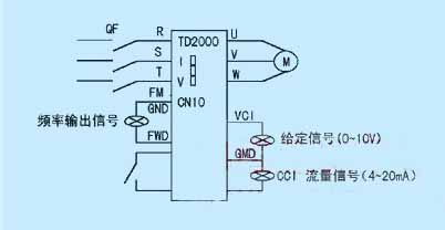 流量设定信号为0~10V,接变频器VCI-GND端子;流量反馈信号为4~20mA(跳线CN10跳在I侧),接变频器CCI-GND端子,变频器采用端子FWD-COM控制启/停。变频器的频率信号由FM-GND端子输出,如图5所示。