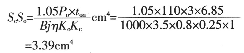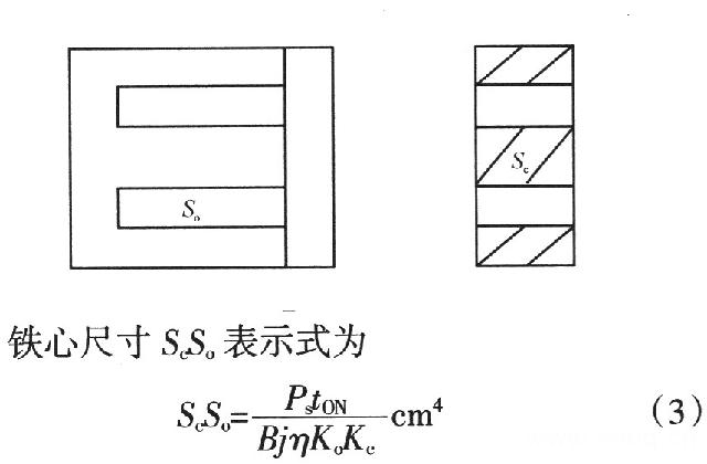 根据负载要求,计算出Ps,便求出ScSo的乘积,然后查阅标准铁心尺寸,分别确定Sc及So的值,再根据Sc确定铁心的具体尺寸,根据So确定窗口尺寸。
