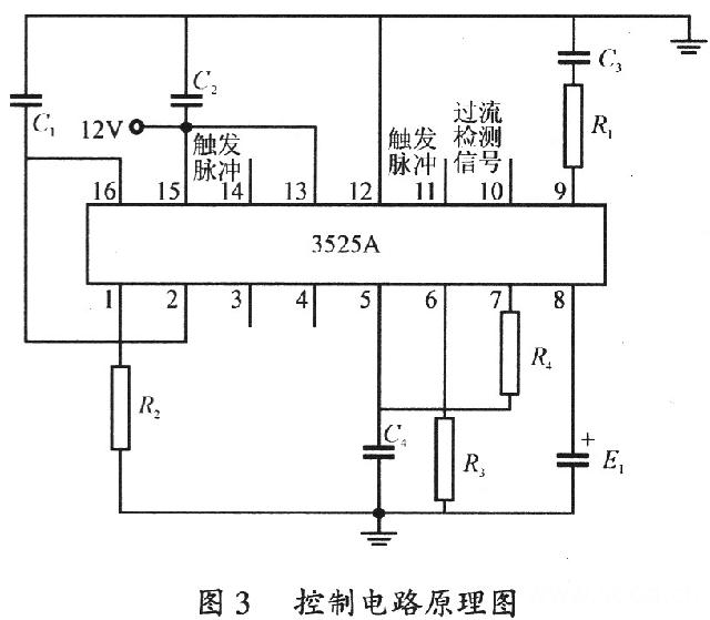 控制电路通常根据设计要求选择典型电路。本文选择了SG525A双端输出驱动MOS功率管的电路。控制电路的原理图主要部分如图3所示。