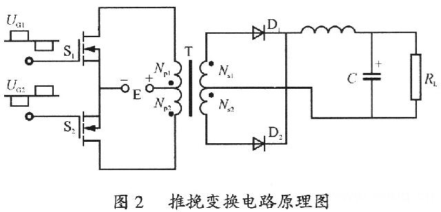 推挽电路如图2所示,S1、S2栅极加倒相的对称激励脉冲信号,激励电压UG1使S1导通,S2截止,则输入电源通过S1、NP1及变压器次级回路向负载供电。在这期间施加于截止管S2上的电压为2E。当激励信号消失时,两管均截止,每管承受的电压为E。同理,激励电压UG2使S2导通,S1截止,电源通过S2、NP2及变压器次级回路向负载供电。在这期间施加于截止管S1上的电压也为2E。当激励信号消失时,两管又都截止,每管承受的电压为E。在上述两个过程中,输出变压器T副边绕组的电压方向相反,输入直流电压变成了矩形波交流电压,完成了逆变任务。