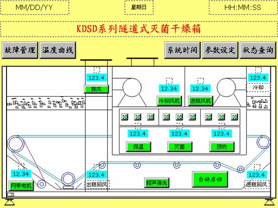 (2)自动启动。按下自动启动按钮后为自动状态,冷却风机启动,延时设定时间后,进瓶风机启动,延时设定时间后,排风风机启动,延时设定时间后,预热加热启动,延时设定时间后,灭菌加热启动,延时设定时间后,保温加热启动,当预热、灭菌、保温三个温度同时大于三个温度设定下限时,网带电机启动,频率按网带电机速度下限设定频率运行,当三个温度均达到设定温度 + -15度时,网带电机按设定频率运行。