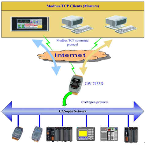 GW-7433D 是泓格公司在 CAN BUS 系列中的一项产品。解决了 Modbus TCP 及 CANopen 通讯协议间的转换问题。借由使用 GW-7433D 网关,无论是 PLC 或 PC Based 的系统都可以透过 Internet/Ethernet 来监控 CANopen 网络上的设备。在 CANopen 网络接口上, GW-7433D 扮演 CANopen Master 的角色,提供 PDO ,SDO 的功能。在 Ethernet 网络接口上, GW-7433D 扮演 Modbus TCP Server 的角色,使用者可以借由使用 Modbus TCP class 0 、 class 1 及部分的 class 2 功能来和 GW-7433D 相互通讯。此外,我们也提供了 Utility 工具软件,让使用者可以建构 GW-7433D 的各项参数及功能,同时也可以很容易的撷取 CANopen 网络设备的数据。