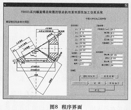 根据YH603系列螺旋锥齿轮数控铣齿机加工参数类型,开发仿真程序界面如图8。界面由三部分组成:(1)参数对照区。螺旋锥齿轮加工参数很多,将各个参数以图例的形式表示方便参数输入,防止参数输入错误;(2)参数输入区;(3)程序操作区。