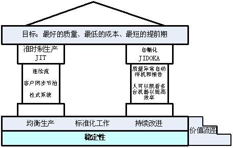 如果把精益生产体系看作一幢大厦,它的基础就是在计算机网络支持下的、以小组方式工作的并行工作方式。在此基础上的三根支柱就是: