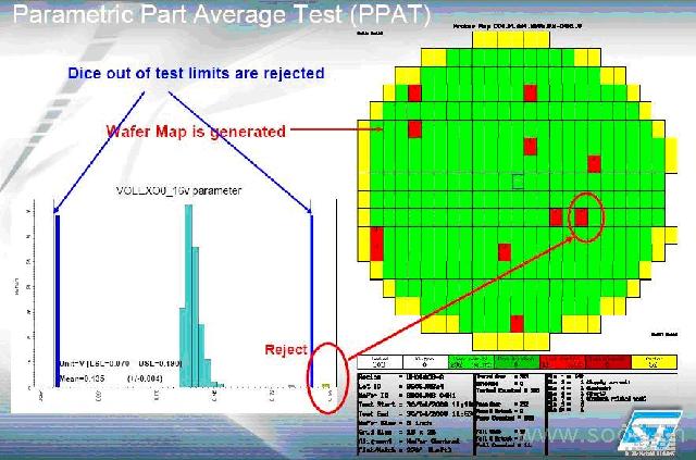 一般AEC-Q001只要求通过静态PAT测试。不过,为了达到更高的质量,ST的汽车等级认证要求同时做到静态、动态及地域性PAT标准。此外,ST的地域性PAT还采用可重复性类型侦测(Repeatable pattern detection)和混合式分析(Composite Analysis)来提升管控质量。通过PPAT,在测试限制外的裸晶会被删除,即使这些裸晶能符合特性要求。这样既避免潜在风险,又能在供货商的阶段即可改善组件的质量和可靠性。