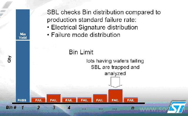 AEC-Q002基于统计原理,属于统计式良品率分析的指导原则。AEC-Q002的统计性良品率分析(Statistical Yield Analysis, SYA)分为统计性良品率限制(Statistical Yield Limit, SYL)和统计箱限制(Statistical Bin Limit, SBL)两种。以SBL来说,它在电性晶圆测试(Eletrical Wafer Sort, EWS)的阶段放置特殊的监控功能于BIN上,各个区域会被取样和分析。这些方法通过对关键性测试参数 / BIN的量测来建立一套分析和控制生产变量的系统,可用来检测出异常的材料区域,保证最终产品的质量和可靠性。