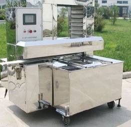 排盘机是处理月饼成型机后面的一道工序,目的把前面成型的月饼按照一定的规则序列排放在烘盘上,然后由烘盘传入隧道炉进行烘烤。