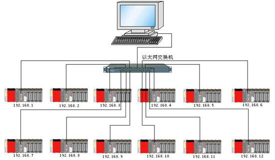 该系统的特点是使用的模块很多,要向上位机传输的数据也非常多,12套PLC中每一套PLC就要传输30个温度测量值和15个温度平均值,还有PID参数以及许多开关量和报警信号等等,为了满足大量数据的高速传输,我们采用了100M以太网进行通讯,不但能满足系统对监控的实时性要求,还大大减少了系统配置和布线的麻烦。