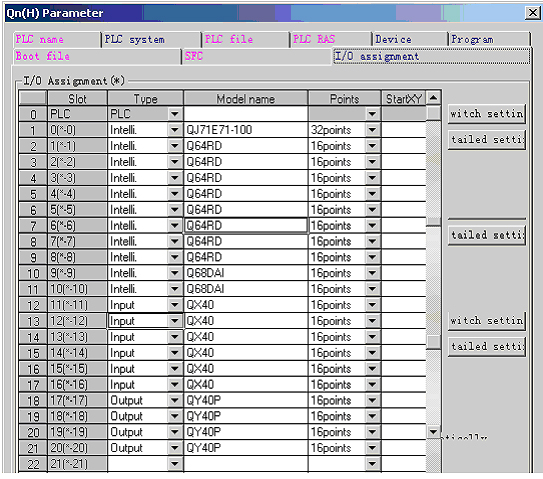 该系统使用了三菱的Q02CPU,智能功能模块Q64RD、Q68DAI,I/O模块QX40、QY40P和通讯模块QJ71E71-100,系统硬件I/O分配图如下图: