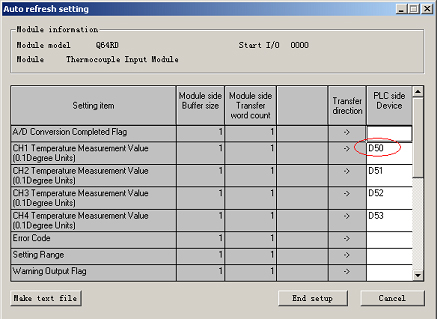 (2)对于Q68DAI模块,为8通道模拟量输出,使用时必须要把数模转换允许标志Y0~Y8置“1”才能正常进行数模转换。在智能功能模块参数设置好以后,发现有一个Q64RD模块出错,经检查,原因是自动刷新里设置的数据寄存器D50,在梯形图程序中使用到,产生地址冲突,改正过来后问题得到解决。