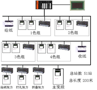 印刷机电控系统(4色印刷机)是由1个主通信控制站,9个变频器,3个伺服电机,9个步进电机,22个远程I/O单元,以及1个挂在总线上的人机界面组成。配置如下: