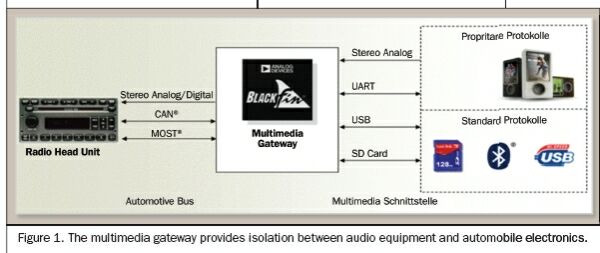 为了支持汽车多媒体应用,嵌入式系统的主要任务(被称为多媒体网关)是对标准化通信协议(如蓝牙、USB,以及数字音频格式的解码)进行适应性修改和转换。多媒体网关采用对软件更新开放的定制可编程处理器,这有助于实现快速开发,并使汽车制造商能够对消费电子市场的快速变化做出恰当的响应。