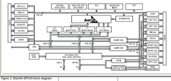 图2所示即为Blackfin多媒体处理器的内部模块示意图。其连接性由许多串行接口(3个SPI、4个UART、4个SPORT和2个TWI)以及一个USB -OTG接口、一个ATAPI接口和一个SDIO接口提供。此外,它还有三个并行接口,用于驱动显示屏、相机和另外一个用于导航服务的处理器。处理器与汽车内部总线之间的连接由两个CAN接口和一个MXVR接口提供。