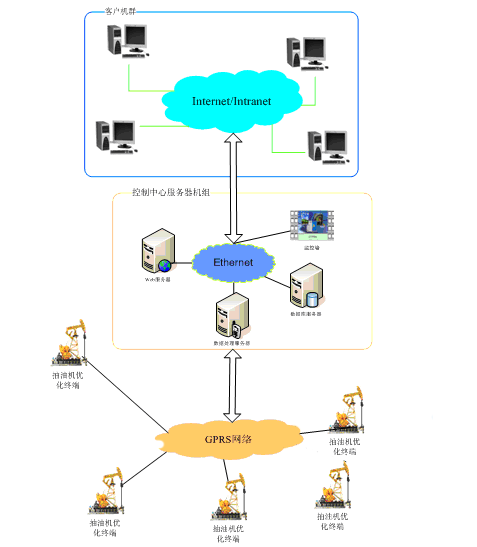 - 通讯层:本层由服务器群组的Ethernet通讯资源子网和GPRS数据传输网组成,负责服务器群组数据交流以及现场采集的实时数据传输。