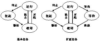 OSEK/VDX将任务分为基本任务和扩展任务。基本任务具有3种状态:运行状态、就绪状态、挂起状态;扩展任务比基本任务增加一个等待状态。基本任务只在开始和结束时才有同步点。扩展任务运行时可能进入等待状态,因此不仅在开始和结束有同步点,而且运行过程中可能有多个同步点。下图所示的是扩展任务与基本任务的状态转化图。