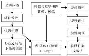 车控电子产品是软硬件结合的嵌入式系统。为了节约资源,缩短产品开发周期,一般应采取软硬件同步开发的方案。车控电子产品的开发工具对软硬件的同步开发、调试提供了很好的支持。车控电子产品的软件开发分为功能描述、软件设计、代码生成、操作系统环境下高级调试等步骤。车控电子产品的硬件开发分为硬件描述、硬件设计、硬件调试等步骤。当软件设计完成后,通过使用相应的工具,完成在虚拟ECU平台上的验证。当硬件设计完成后,与硬件一起进行软硬件集成调试。通过这种开发方式,缩短了产品上市的时间。