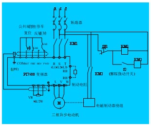 1、引言 普传科技PI7600系列变频器是公司积多年变频技术产品应用实践和电气传动技术发展创新研发的新一代变频器。全新的软件升级、更合理的工艺结构,特别是严格的检验使产品具有更高、更精、更高效的特点,在变压器绕线机生产线上使用,实现了绕线机系统的自动调速控制,变频器的输出频率可以通过主板端子上的外接电位器在0.0~800.00HZ范围内任意可调; PI7600系列变频器具有过压、欠压、过流、过载等共十二种保护功能,可以使用端子上的自由停车功能,通过强大的软件功能的简单设置,实现了变压器绕线机系统的上述工艺要求,并且实现了保护三相异步电动机的损坏, 使整个系统的使用寿命延长;提高了工作效率,保证了各种变压器的生产质量。 2、变压器绕线机系统的组成及工作原理 2.1 此系统从拖动角度由三部分组成:控制单元、传动机构、生产机械. (1) 控制单元:变频器、电磁制动器、三相异步电动机。其作用是产生拖动变压器绕线机的原动力,决定系统的速度,变频器保护三相异步电动机的安全稳定的运行;电磁制动器反相制动使电机快速停车,从而达到变压器绕线机系统的工艺要求。 (2) 传动机构:皮带与带轮。其作用是将电动机的转矩传递给绕线机,带动绕线机转动。 (3) 生产机械:变压器绕线机。其作用是通过齿轮的转动将各种型号的铜线缠绕到变压器骨架上,从而绕制成各种规格型号的变压器。 2.2 变压器绕线机系统的工作原理: 3、控制系统的电路设计