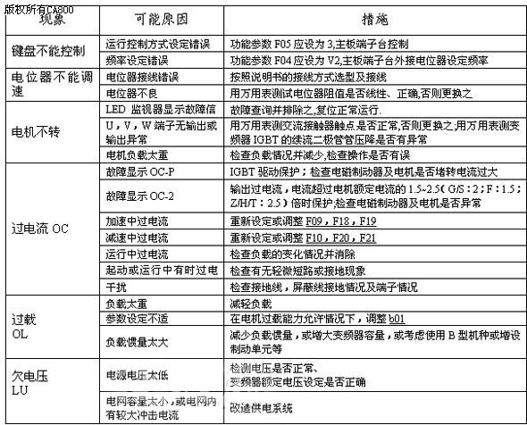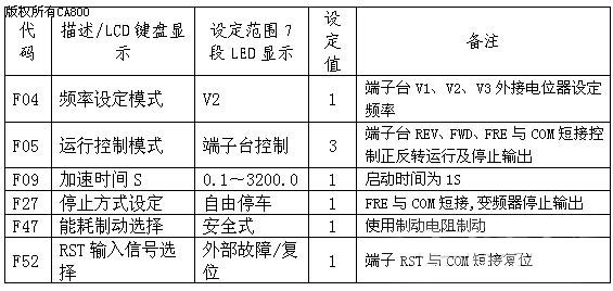 ![]() 图2 三相异步电动机控制系统 3.1 接线注意事项: (1) 变频器的控制回路(图中 为控制回路端子)的控制线必须采用屏蔽线(图中 为屏蔽线)并且远离主回路(图中 为主回路端子)接线,屏蔽线仅一端接地. 3.2 电磁制动电动机采用变频调速时注意事项: 4、变频器部分功能参数设置如下表: 作业人员脚松开微动开关S2,接触器KM2线圈失电,接触器常闭触点KM2吸合,常开触点断开,变频器主板端子FRE与COM短接执行自由停车命令,变频器停止输出并开始制动, 制动器的励磁绕组没电按照延时继电器设定时间反相制动抱闸,使电动机停车,达到绕线机系统停止;当变频器跳过流、过压、过载、干扰保护时,按复位按钮SB2则变频器主板端子RST与COM短接,可立即复位恢复正常使用。 此系统可以频繁快速的运行停车,工作性能稳定。 6、变频器常见的故障现象及排除措施: 结束语: 参考文献 |