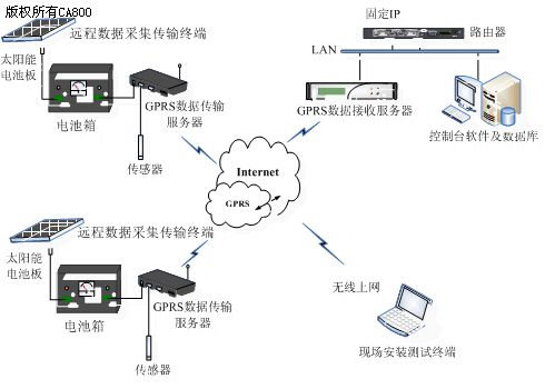 远端监测点又由三个部分构成:数据采集器、GPRS数据传输器及数据传输设备电源。数据采集器:我们采用传感器对地下水的水位进行监测;GPRS数据传输设备可以将所采集的数据按照用户设定的上传时间间隔上传而数据传输设备电源采用太阳能供电方式,适合工作于野外无人值守的环境中。