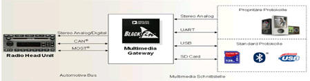 为了支持汽车多媒体应用,嵌入式系统的主要任务(称为“多媒体网关”)是适配并且转换专用和标准的通信协议,例如蓝牙协议、USB协议以及数字音频格式的解码。多媒体网关使用对软件升级开放的定制的可编程处理器,因此可以加快开发,并且可使汽车制造商能够对消费类电子市场的快速变化做出合适的响应。