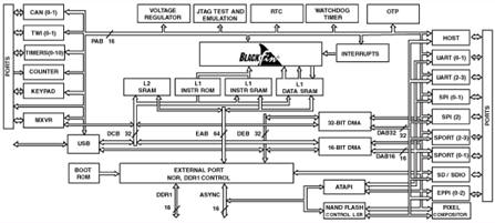 Blackfin多媒体处理器的内部结构如图2所示。连通性通过许多串行接口(3个SPI、4个UART、4个SPORTS和2个TWI)以及一个USB-OTG接口、一个ATAPI接口和一个SDIO接口提供。此外,它具有三个并行接口用于驱动显示屏、数码相机和另外一颗用于导航服务的处理器。两个CAN接口和一个MXVR接口可提供处理器与汽车内部总线之间的连接。
