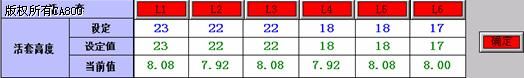 (2)套高设定区:第一行为设定值输入,设定值为活套要求高度(角度),每次输入后按回车键(Enter)确认,都设定完毕后请按画面上确定按钮.然后看第二行设定反馈值是否已经显示为要求值,如果不是,请重新在第一行设定并按确定按钮.第三行为当前活套高度反馈值显示,与其他画面同。