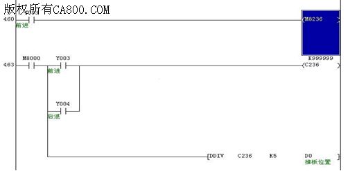编程中其它应注意的问题。一是双线圈问题。本工程中利用条件跳转和步进指令避免了双线圈问题。二是误信号问题。编码器是一种比较精密的光电产品,受振动时不可避免的会出现误信号,而切纸机在执行裁切动作时会造成很大振动,如果忽视这个现象,定位精度和执行机构当前位置的显示都会不准确。本工程中处理方法参见上面例子程序图1,只有Y3、Y4接通,即只有进给机构前进和后退时才让C236进行计数,这样就屏蔽了裁切时震动造成的误信号。