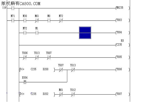 此工程中程序的难点主要在于数据的处理上。在切纸机工作过程中除手动让进给定位机构前进后退外,还要实现等分裁切功能和指定具体位置定位功能,并且HMI上还要即时显示定位机构的当前位置。我们为了简化程序中的计算,采用了两个高速计数器C235和C236。C236通过计算前进后退的脉冲数,再进行换算后用于显示进给机构的当前位置;C235用于进行精确定位。定位过程是这样的,每次进给机构需要定位工作时,通过计算把需要的脉冲数送到C235,不论进给机构前进还是后退C235进行减计数,同时对C235中的数值进行比较,根据比较结果驱动相应的输出点对变频器进行输出频率的控制,实现接近设定值时进给速度变慢,从而达到精确定位。因为任何系统都有惯性和时间上的迟滞,所以变频器停止输出的时间并不是C235中的计数值减小到0时,而是让C235和一个数据寄存器D130比较,当C235中的值减小到D130中的设定值时PLC控制变频器停止输出。D130的值可通过人机界面进行修改和设定,在调试时通过修改这个值,以达到定位准确的目的。显示定位机构当前位置的程序见下图1,