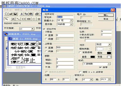 还有一个问题是参数设定时的小数点位问题,实际工作中在设定位置时要精确到0.1mm。这个问题在一些单片机系统中常会遇到,常见的处理办法是加大一个数量级,就是设定数据时,在人机界面上用1代替0.1mm,10代替1mm。不过我们在处理此问题时通过HMI中对数据的设置和PLC的程序编写达到了所见即所得的效果。HMI中主要是对数值的格式要设定好。HMI中的设置画面见下图。