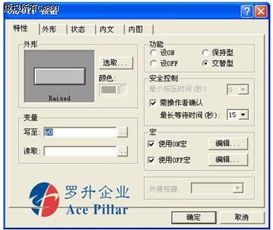 双击按钮,弹出ON/OFF按钮属性对话框,特性设置参考Demo01说明,这里设置的是交替型按钮写至Y0,选择需操作者确认/使用ON宏/使用OFF宏。如图一: