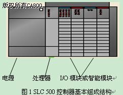 SLC500系列PLC有固定式和模块式两种硬件结构,固定式集处理器,电源,输入/输出(I/O)于一体,由其输入/输出方式(直流、交流;电压等级;源流、汇流;继电器、可控硅、和晶体管输出等)及I/O点数的不同共有24种不同型号,固定式控制器还提供一个两槽扩展框架以增加其输入/输出的灵活性。模块式SLC系统可根据需要从5种处理器,7种电源,及50余种I/O模块或特殊功能模块中选择不同的组合,形成一个应用灵活、功能强大的控制系统。SLC500系列的所有模块都通过了CSA认证,大部分模块通过了危险环境认证,适用于很多工业应用场合。图1是模块化SLC500控制器的硬件结构。