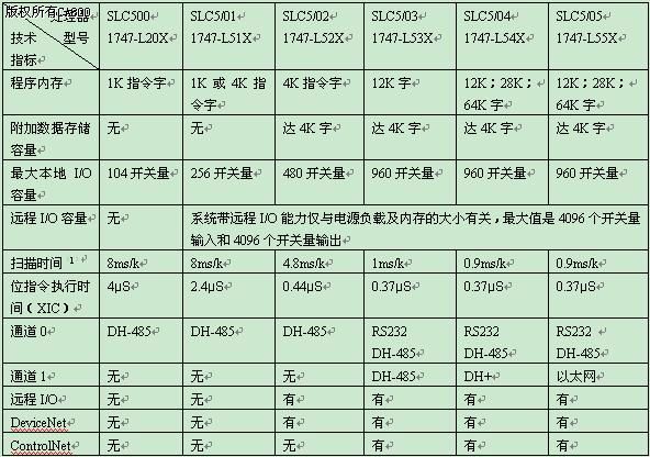 SLC500系列模块式PLC有5种处理器模块,处理能力及运行速度不断增强,每种处理器模块都有一个内置的DH-485网络接口,可以进行编程及监控。SLC5/03及更高系列号处理器还有其它网络接口,可以连接到不同的网络中。SLC500系列处理器还具有强制输入输出、故障诊断、分级口令保护及灵活的中断等功能,有利于用户调试程序,检测故障及处理器文件的保护。表1列出了5种型号SLC500系列处理器技术参数及通讯能力。