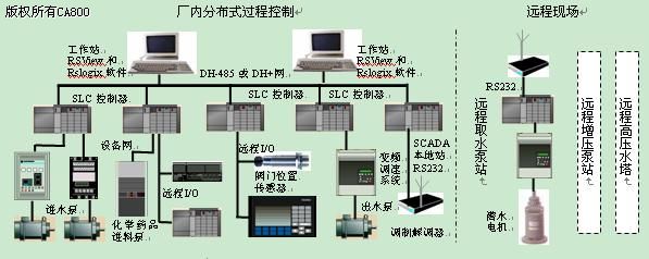 SLC500系统在工业控制中已得到广泛应用,如在冶金、化工、轻工、电力、机械等各行业都有很多成功的应用实例。图2是SLC500系统系统在水处理中的集散控制应用实例,水处理厂的厂内控制层采用DH-485或DH+网,实现处理器之间的通讯及上位机监控,设备层采用远程I/O和设备网对厂内的远程设备进行控制。对于离水处理厂比较远的泵站(水源及用户的用水量等)采用SCADA数据采集系统,通过调制解调器采集远程泵站的数据,主控系统根据采集的数据,自动调整远程站的工作情况,实现了整个供水系统的自动控制。