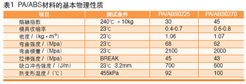 PA/ABS合金同时具备了PA优异的抗化学腐蚀性、热稳定性和ABS良好的尺寸稳定性、低温抗冲击性能,同时结晶材料与无定型材料的结合还使得PA/ABS合金获得了良好的减震和吸声性能,因而非常适合汽车内饰的应用。具体的产品性能特点见表1。
