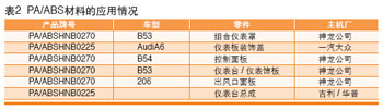 锦湖日丽公司早在2004年就开始配合神龙汽车公司的需求来开发PA/ABS合金,目前主要有HNB0225和HNB0270两种牌号的产品以及矿物填充系列产品。PA/ABS主要应用于汽车仪表板周边部件,如控制面板、仪表盘罩以及空调出风口等内饰件应用。其具体的应用情况见表2。