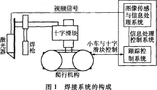 爬行式弧焊机器人系统的构成主要由永磁履带爬行机构、激光图像传感系统、信息处理及跟踪控制系统所组成,如图1 所示。爬行机构是机器人的运动动力系统;图像传感与信息处理系统构成焊接识别系统,以识别焊缝,与跟踪控制系统一起组成焊缝跟踪系统,以实现运动中的焊缝跟踪和焊接。