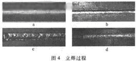 a. 在早期试验中,电流、电压值与焊速的匹配总不令人满意。采用的MIG脉冲焊,其宜于用较小的平均电流进行焊接,特点是熔池体积小,不易淌流,且在脉冲峰值电流作用下,熔滴的轴向性好,故比起普通氩弧焊更有利于焊缝成形,在全位置焊中有很好的效果。试验中早期打底焊焊速一般在8cm/min以上,相应电流值也较高,在95~105A之间,焊接过程不太稳定,背面成形有时也不理想。究其原因,在于脉冲幅值的影响,脉冲电流使熔滴呈喷射过渡,在较大脉冲电流下较小的电压易造成大飞溅、淌流,而大电压表面成形也不理想。我们在试验中不断摸索,后在稳定幅值的前提下适当减小电流、电压并且降低焊速,这样在横向和垂直位置的焊接过程中,充分发挥出了脉冲焊工艺在全位置焊上的优点,焊接过程稳定,飞溅小,两面成形都很理想。图4a、图4b、图4c、图4d 依次为立焊焊前加衬垫样板、立焊背面成形、打底和盖面成形样例。