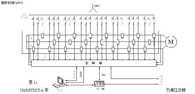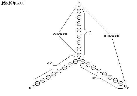 图1:HARSVERT-A系列高压变频调速系统电路拓扑图 (2)功率单元电压叠加原理 图2为变频器的单元串联基本原理图。每个功率单元输入700V三相交流电压,输出 690 V单相交流电压,每相的8个功率单元串联叠加后可输出相电压5520V,每两相间相差120°电角度。 由于变频器中性点与电动机中性点不连接,变频器输出实际上为线电压[1],由A相和B 相输出电压产生的输出线电压可达到10kV,线电压不仅具有正弦波形而且叠加的阶梯波数也成倍增加,因而谐波成分及dv/dt 均较小。