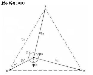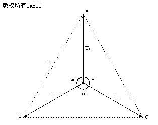 图2:单元串联电平叠加基本原理图 2.3 单元串联多电平型高压变频调速系统主要特点 (1) 功率单元故障时继续运行 当某个功率单元发生故障时可自动旁路运行,变频器不停机,即在每个功率单元输出端之间并联旁路电路,当功率单元故障时,封闭对应功率单元IGBT的触发信号,然后让旁路导通,保证电机电流能通过,仍形成通路。 为保证三相输出电压对称,有的系统是在旁路故障功率单元的同时,另外两相对应的两个功率单元也同时旁路,这样将使输出电压明显下降,变频器需降额使用。以10kV系统为例,当1个功率单元故障后,每相将剩下7个功率单元,输出最高电压为额定电压的87.5%。 为了在功率单元旁路时尽量减少输出电压下降幅度,HARSVERT-A系列高压变频调速系统采用零点漂移法,以提高输出电压,同时保证三相平衡。如图3所示。设功率单元旁路前的线电压为U1,相电压Ua=Ub=Uc=U,设B相一个功率单元旁路后的线电压为U2,此时相电压为Ub′=7U/8,根据余弦定理,对图4中△AOB列方程有:Ua2=U22+Ub′2-2 U2×Ub′ ×cos30°,即64 U22-56 U× U2-15 U2=0,又U1= U,则解得U2/ U1=0.9567。