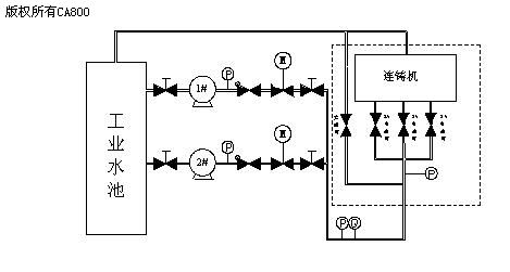 图4:单个功率单元旁路后的电压相量图 可见,零点漂移法在单个功率单元故障时可使最高输出电压为额定输出电压的 95.67%,与同时旁路另外两个完好功率单元的方法相比,电压输出能力有了较大的提高。 (2) 电机侧的谐波和dv/dt少,适用普通异步电动机 移相变压器二次绕组采用延边三角形接法,实现多重化,以达到降低输入谐波电流的目的,输入电流波形接近正弦波,总的谐波电流失真小于1%,输入的功率因数可达0.95以上[2]。 输出电压非常接近正弦波,每个电平台阶只有单元直流母线电压大小,所以dv/dt很小。功率单元采用较低的开关频率,以降低开关损耗,提高效率。输入电机的电压等效开关频率大大提高,电平数和等效开关频率的增加有利于改善输出波形,降低输出谐波,由谐波引起的电机发热、噪音和转矩脉动都大大降低,因此对电机没有特殊要求,可直接用于普通异步电动机。 (3) 系统故障可旁路到工频运行 由于系统配有旁路柜,内置真空接触器和高压隔离开关。真空接触器可根据S7-200 PLC的指令实现泵组变频运行和工频运行之间的电源自动切换,尤其在变频器故障状态下可将当前变频运行的电机迅速切换至工频运行,从而避免了管网压力和流量的突变,满足了连铸生产用水连续性、可靠性的要求。 3.连铸喷雾冷却供水系统工艺简介 连铸喷雾冷却供水泵组采用两台MTC-A-50/04型多级泵,配套MGF-400C型异步电动机,运行时开一备一,系统工艺流程如图5所示。