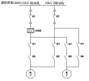 图5:连铸喷雾冷却供水系统工艺流程图 正常运行时,单台泵工频运行,全天24小时不间断向炼钢厂供水,在连铸机不浇铸时工业水通过位于炼钢厂入口处的旁通阀流回工业水池。 4.控制系统设计 4.1 系统电气设计 根据实际工况要求,由于连铸机在生产时对供水的连续性要求非常高,如果突然中断供水将会严重影响产品质量,从保证供水连续性角度考虑,结合供电系统的实际情况,决定采用恒压供水控制方式,电气主回路采用一拖二方案。 (1)电气主回路原理 如图6所示,QF1为1#泵对应高压柜内的真空断路器,现用于向变频器供电,QF2为2#泵对应高压柜内的真空断路器,现用作工频电源。真空接触器KM1、KM2、KM3、KM4以及高压隔离开关QS1、QS2、QS3、QS4安装于旁路柜内,其中,真空接触器用于电动机工频和变频运行的自动切换,高压隔离开关一般情况下处于合闸状态,仅在变频器检修时拉开,用于电动机工频运行情况下对变频器进行安全检修。 (2) 改造后泵组运行方式 正常运行状况下,单台泵变频运行,一用一备,当变频器出现故障时,当前变频运行的泵自动切换至工频运行;当运行电机出现故障时,自动工频启动备用泵。 倒泵操作时,首先将变频运行的泵切换至工频运行,然后将备用泵变频启动至50Hz,此时,两台泵出口压力相同,不会发生环流现象,最后将工频运行的泵退出运行,变频器根据设定压力自动调节输出频率,以保持管网压力恒定。 通过对真空接触器的电气联锁,保证两台泵不能同时变频运行或工频运行,同一台泵不能工频和变频同时运行。