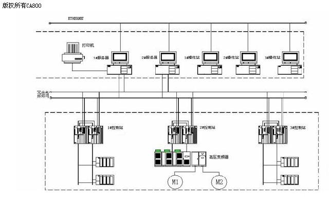 图6:电气主回路原理图 4.2控制系统网络设计 如图7所示,原系统采用一体化控制系统来完成各系统的温度、压力、流量、液位等工艺参数的显示、控制以及各类泵、阀等设备的监控操作和电气室中电气设备的监视。中央监控系统共设置两台服务器、三台操作站,同时设有三个AS(自动化控制系统)站,采用三套西门子S7-400 PLC对炼钢水处理站内所有工艺设备及电气仪表设备实行集中监控,通讯网络在底层采用Profibus DP总线。两台服务器、三套PLC通过100Mbps冗余光纤环形网相连,三台操作站通过以太网与两台服务器相连,转发控制命令。配置一台打印机,用于报表打印。